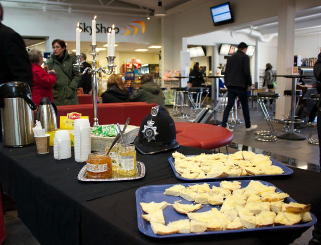 Resenärerna på premiärflighten bjöds på te, scones och engelsk marmelad.