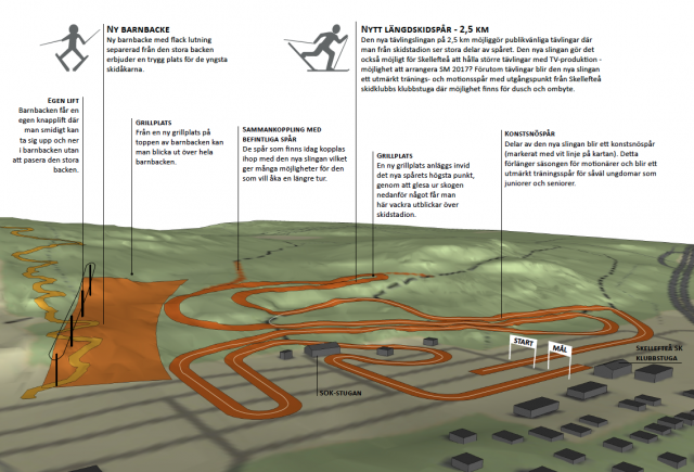 – Ett nytt längdskidspår kommer också att anläggas ovanför skidstadion med möjlighet för publikvänliga tävlingar där man från skidstadion ser stora delar av spåret. Det blir också ett utmärkt tränings- och motionsspår med utgångspunkt från Skellefteå skidklubbs klubbstuga där det finns möjlighet till dusch och ombyte.