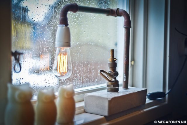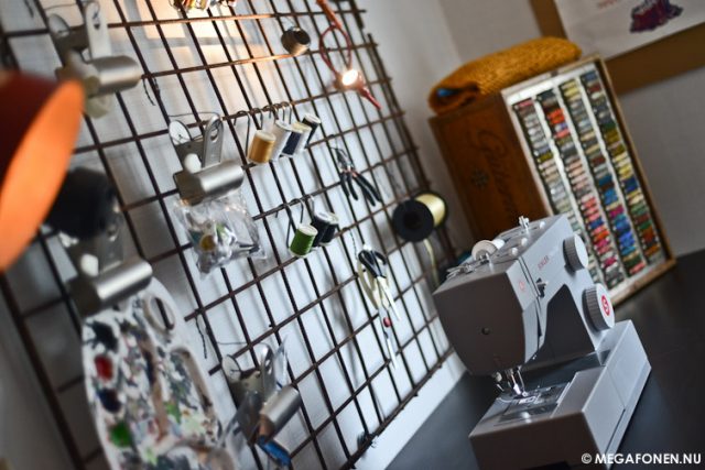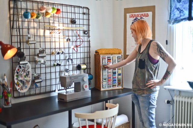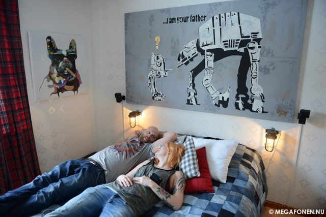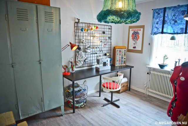 Och det är inte det enda i sovrummet som de gjort själva. Tavlorna har Sofie målat, en av lamporna är byggd av kassettband och byrån är tapetserad med gamla skivomslag.