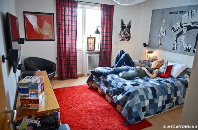 I sovrummet ligger ett stort lapptäcke som överkast – som de tillverkat av sina kompisars jeans.