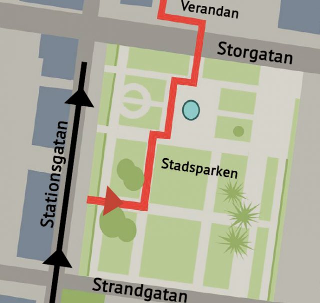 Bilarna ska komma över parkbron för att släppa av paren och sedan fortsätta på Stationsgatan. Röda mattan går genom parken likt bilden visar.
