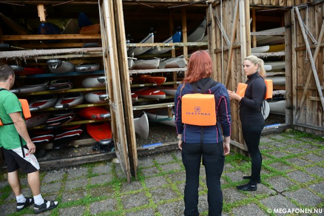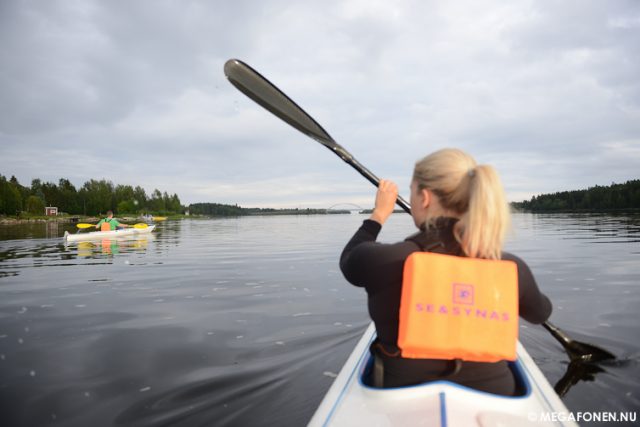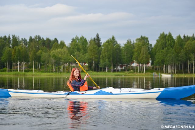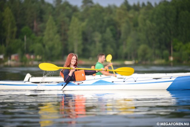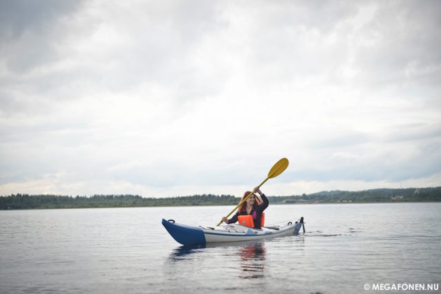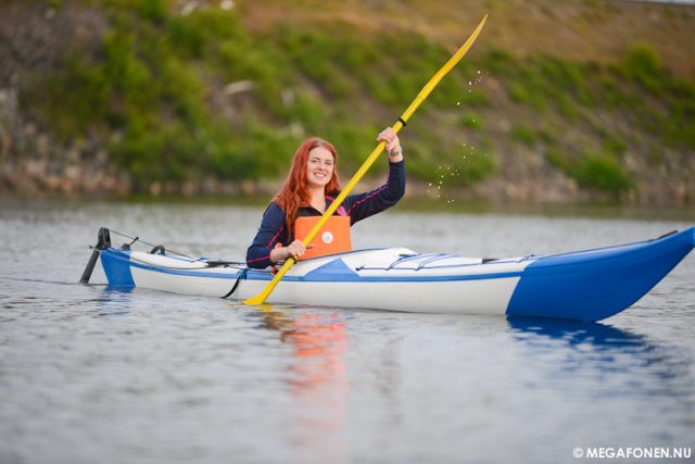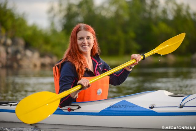 Själv sitter jag stabilt i kajaken – men det är inte min förtjänst. Framför mig sitter Bella Öström i den dubbelsitsiga kajak som hon valt åt oss.