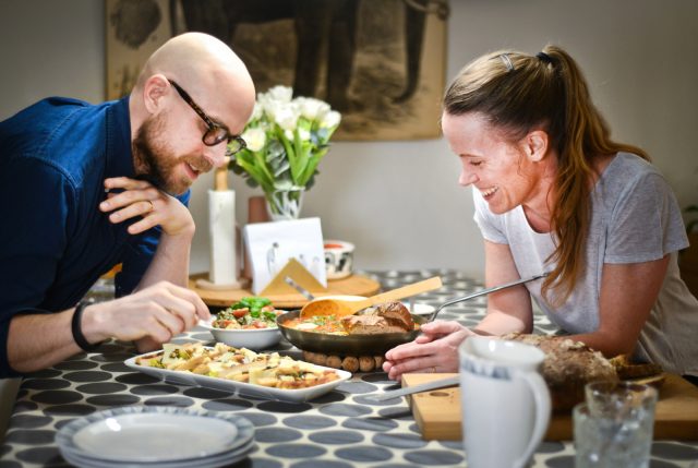 Doften från surdegsbrödet i ugnen sprider sig i lägenheten i centrala Skellefteå. Vid spisen står Erik Lindkvist och tittar till den tunisiska grytan shakshuka och vid köksön hackar Evelina Örn sallad.