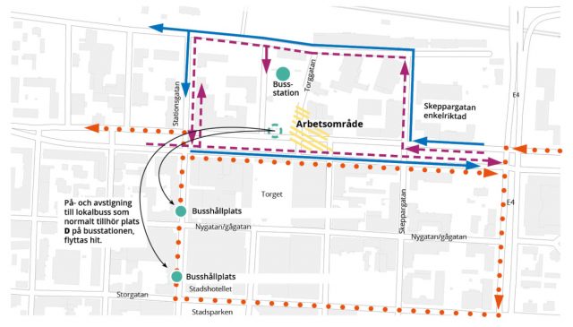 Alla linjer som normalt stannar vid centrumhållplatsen på norra Kanalgatan flyttas till Stationsgatan. Det blir en hållplats utanför Stadshotellet och en högre upp ovanför Nygatan. Lokalbussarna kommer med andra ord inte att följa resterande trafik utan kommer att gå via Storgatan och upp igen längs med Stationsgatan. Detta påverkar även hållplatsen utanför Norran-huset som inte trafikeras under perioden. Hållplatserna vid Kanalgatans södra körfält fungerar som vanligt.