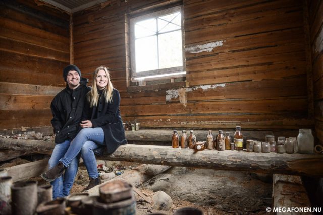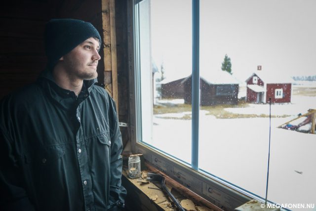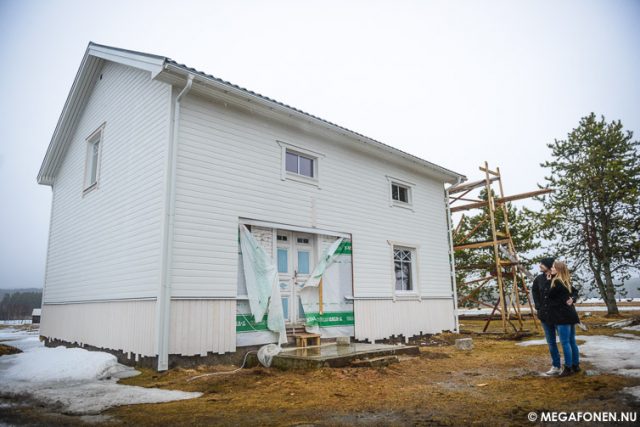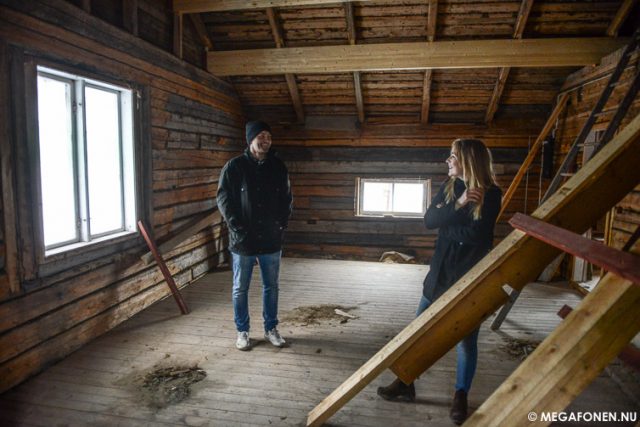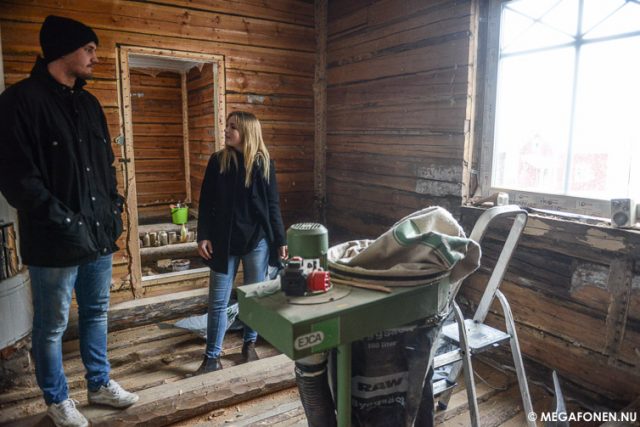 Trots att vi kommit en bra bit in i april faller stora vita snöflingor ner på vindrutan när jag svänger in på gården i Västra Skråmträsk. Isabell Lundberg, som just har tagit in hästarna i stallet, följer mig in i det gårdshus där hon, tillsammans med sin sambo Fredrik Burlin, bor under tiden de renoverar det stora timrade huset som står intill.