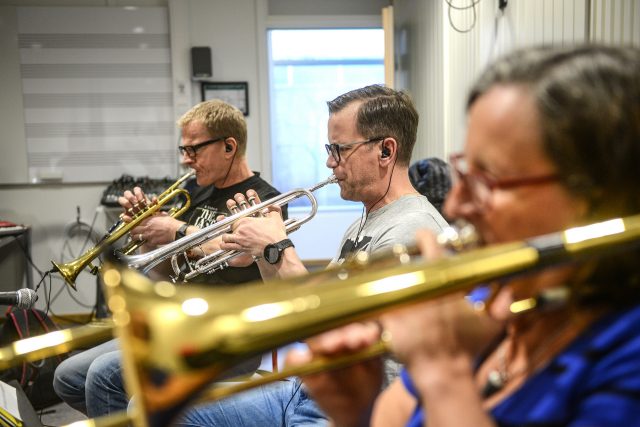 I en musiksal på Anderstorpsgymnasiet har ett tiotal musiker och sångare samlats för att repetera när Megafonen kommer på besök en tisdagskväll i april. Några av dem är musiklärare, vissa syns frekvent på olika scener i Skellefteå och andra är hobbymusiker.