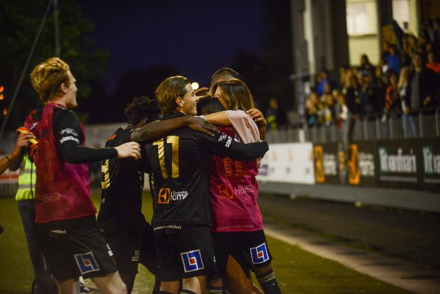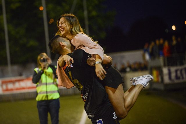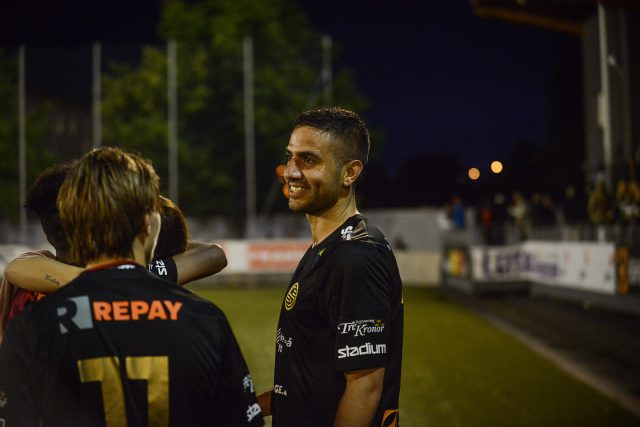 NÖJE Soo Shim Taekwondos Elin Johansson gick ner på knä framför Skellefteå FF:s Jacob Stephenson efter torsdagens derbymatch i Skellefteå.