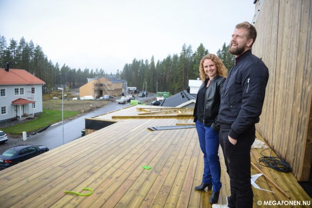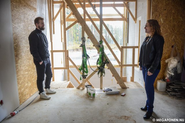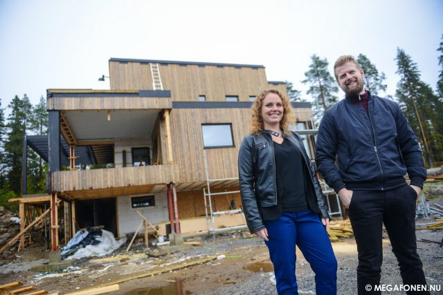 När Megafonen besökte tomten på Eriksberg förra året hade husbygget just påbörjats och endast de ritningar och skisser Patrik och Evelina visade kunde ge en hint om hur huset skulle se ut. Nu, ett år senare, står den stora villan på plats – men invändigt är det en hel del kvar att göra.