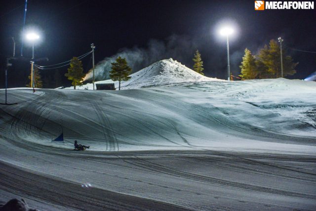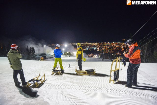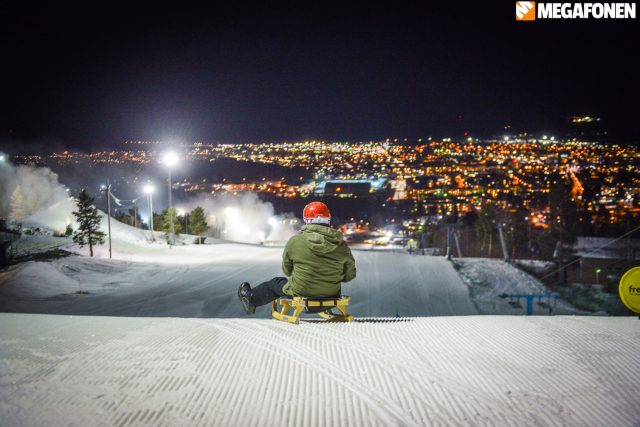 Termometern har letat sig ner mot -15 grader när liften går igång på Vitberget denna onsdagskväll. Det är mörkt och kallt, men det hindrar inte gänget som samlats för att åka kälke tillsammans.
