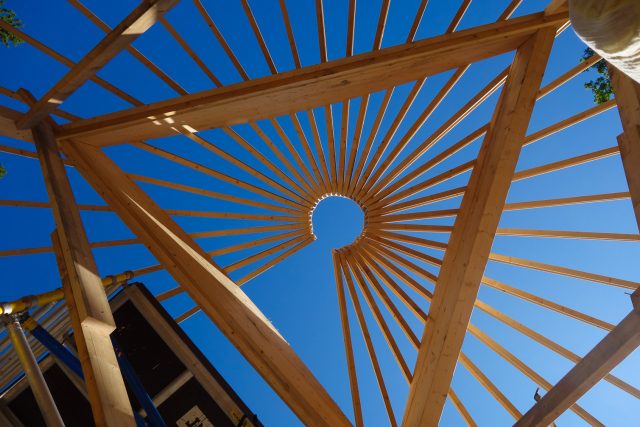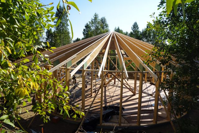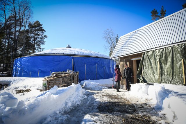När vi kommer fram till gården denna onsdagseftermiddag är det nollgradigt och kalla vindar i luften. Det blivande huset är än så länge täckt av blå presenningar – men dess runda form går inte att undgå.