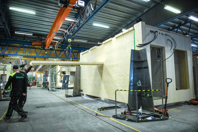 I fabriken håller en rad hotellrum som nämnt på att byggas. De byggs i moduler där väggar, tak, fönster, dörrar och badrum monteras i tur och ordning.
