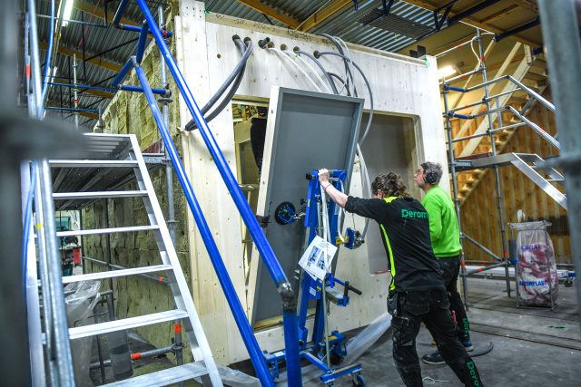 – Det är så här många bostäder byggs nu för tiden. Ju mer man kan göra i fabriken desto bättre, säger Jocke.
