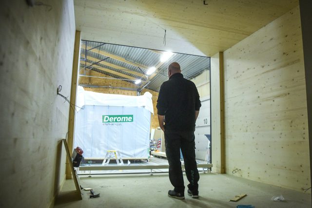 Arbetet är i full gång när Megafonen besöker Deromes husfabrik i Renholmen norr om Byske. Fram till besöket har 22 hotellrum producerats – och från och med nu ska 10 rum i veckan sättas ihop fram till att alla 205 är levererade till kulturhuset i centrala Skellefteå.