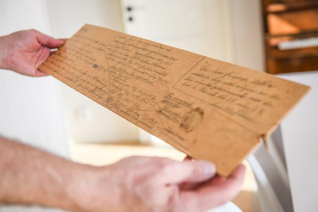 Vi hittade en skiva under trägolvet där husets historia och vilka som bott här beskrivs.