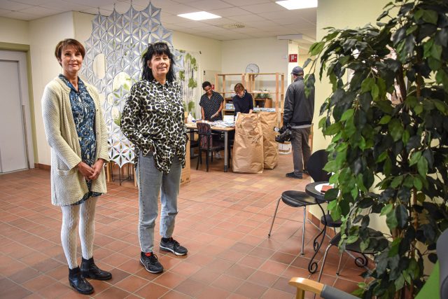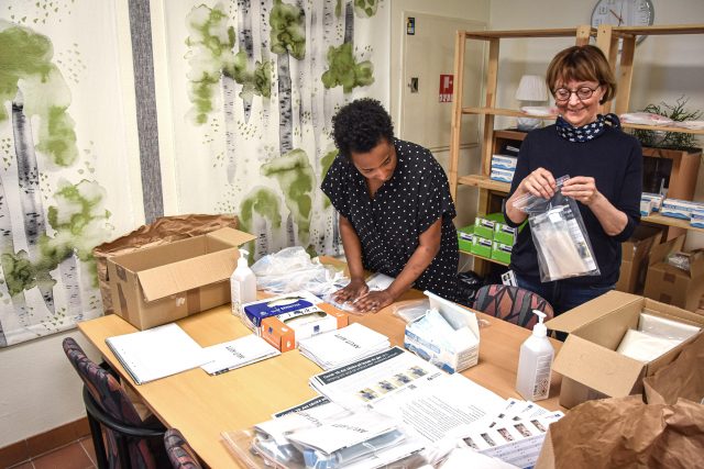 På måndagsförmiddagen packar Maria Wikström och Mona Holmgren utrustningen i färdiga kit inne på äldreboendet Höken i centrum. Därifrån ska paketen fördelas till olika arbetsplatser inom stöd och service samt vård och omsorg.