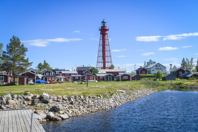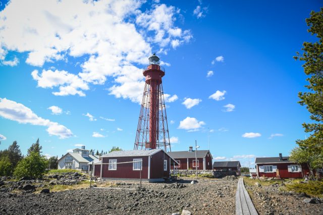 Efter cirka 15 minuters båtfärd ser vi den 37 meter höga järnfyren som sträcker sig mot skyn ovanför de rödmålade stugorna.