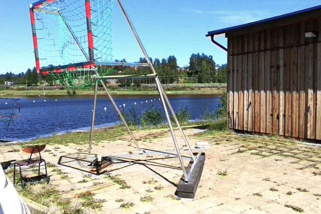 Ett av målen hade då kastats i vattnet. Ramen har tagit skada och flytblock har slitits loss. Klubben har tvingats avsätta ganska mycket tid för att få upp allting och laga det som gått. Vid 14-tiden på måndagen hade alla delar ännu inte kommit till rätta.