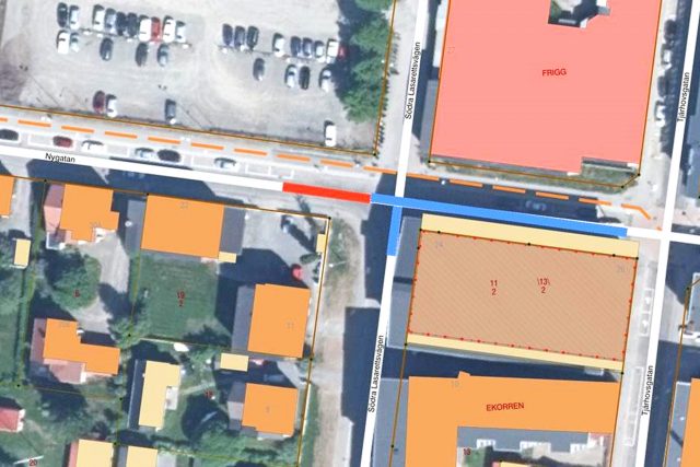 Sedan tidigare har en del av Nygatan varit stängd för passage (röd markering). Under tisdagen kommer avstängningen att flyttas ut tillfälligt (se röd och blå markering).
