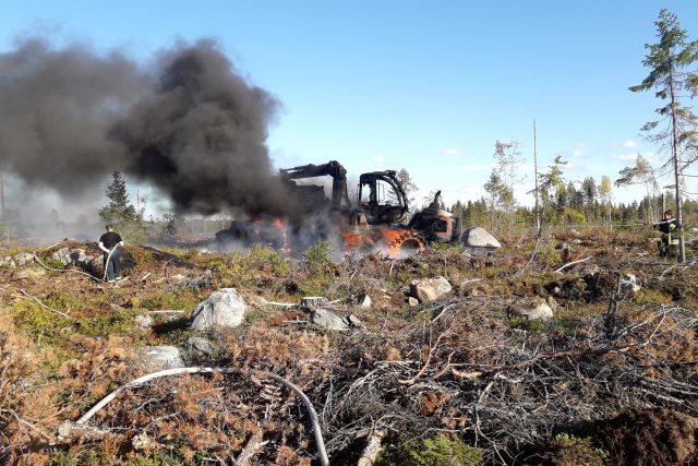 En operatör vid SOS Alarm berättar att det brinner i en skogsmaskin.
