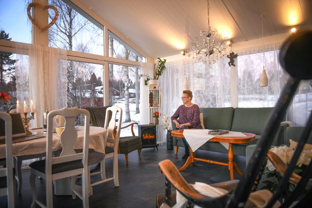 De gröna sofforna har alldeles nyligen kommit på plats i inglasningen vid sjön i Gärdsmark när Megafonen kommer på besök. Här vill Åsa Hägglund Larsson, som nyligen startat eget företag, bjuda in till samtal med människor som på olika sätt behöver hantera till exempel stress eller ensamhet.