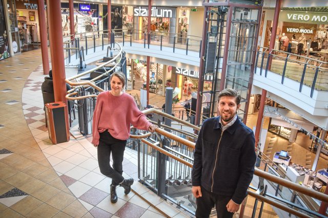 – Sedan ska vi klä in vårt atrium i guldplåt, rulltrapporna också. Det blir guldtema, säger Julia och Viktor förklarar att de har ”guldstaden” Skellefteå i åtanke här.