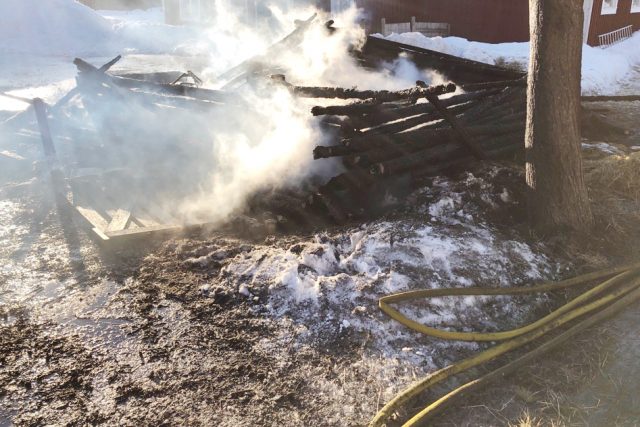SOS larmades klockan 14.13, räddningstjänsten ryckte ut och möttes snart av en övertänd byggnad. Räddningstjänstens Johan Marklund berättar att den lilla ladan användes som förråd. Den fick brinna ned medan styrkan höll koll på situationen.