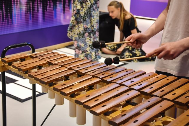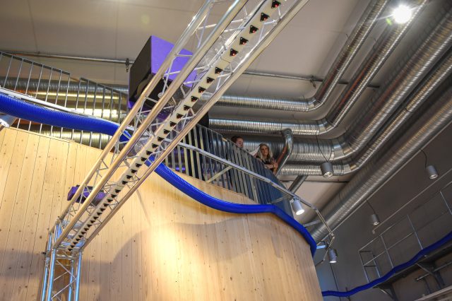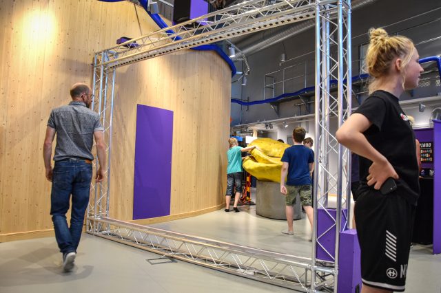 Upprymda elever skyndar runt och provar de olika delarna. En del brister ut i skratt, andra i förvåning. Här finns bland annat pianotangenter på golvet, en rörtelefon som visar hur ljud färdas (även om det bara är en viskning) och mer. Innanför det klippta bandet står en enorm laserharpa, som skapar musik när strålarna bryts i dess valv.