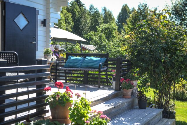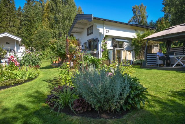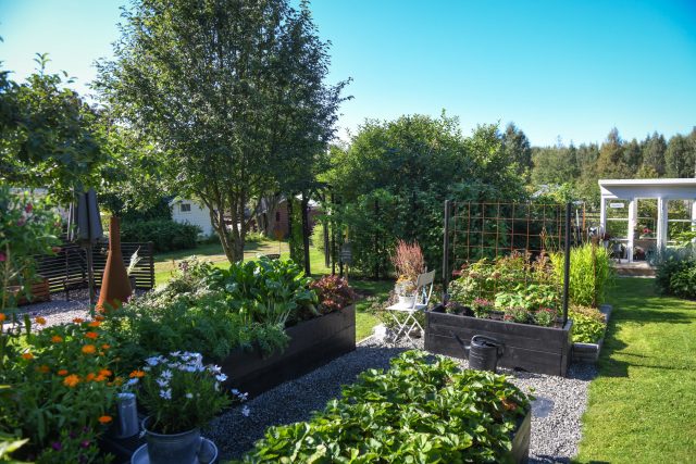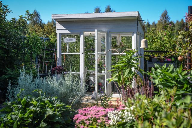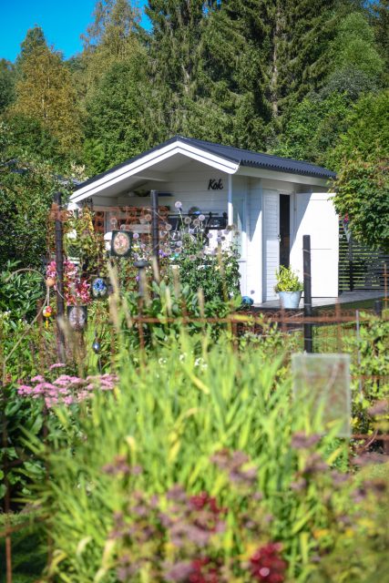 Totalt är varje lott 300 kvadratmeter stor, vilket enligt Håkan och Marie är alldeles lagom. Sedan de köpte stugan 2008 har de byggt ett växthus, en grillhörna och anlagt odlingar med vackra och ätbara saker.