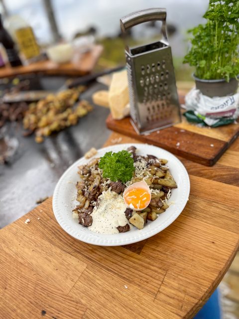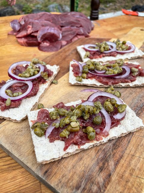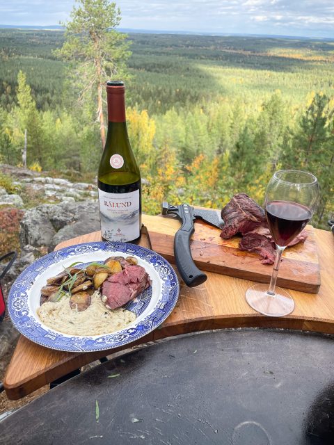 De har lagat biff a’ la Rydberg på älginnanlår, vildfångad fjällröding med romsås och kantareller, entrecote på renkött och tjädergryta – som Ludwigs granne bidragit till.