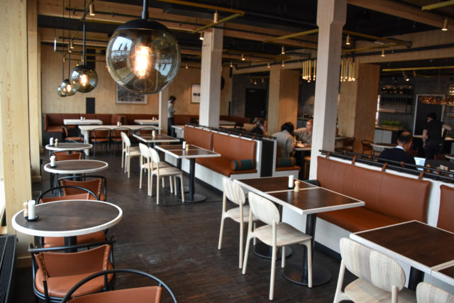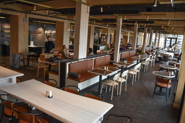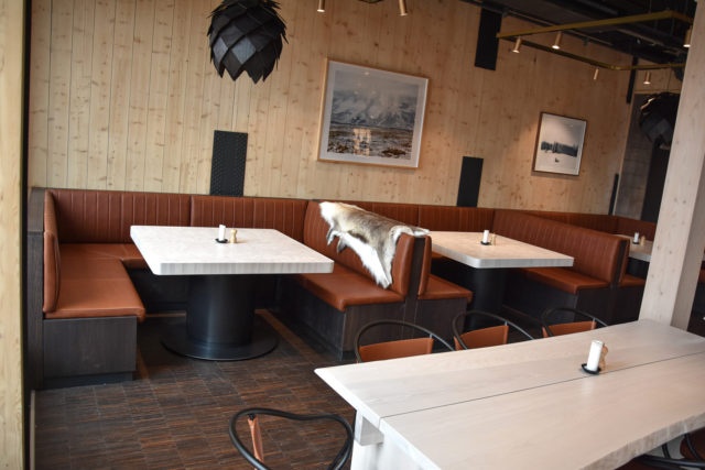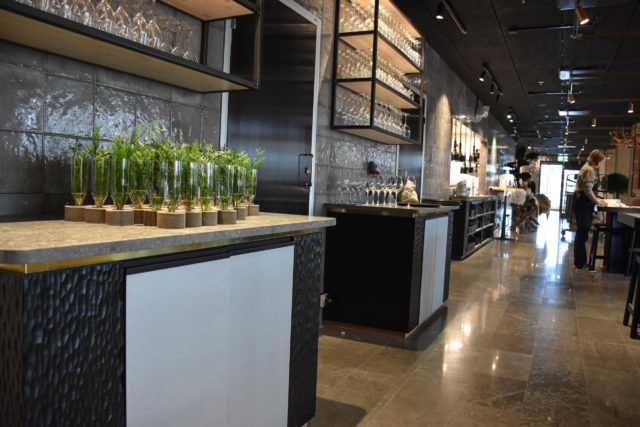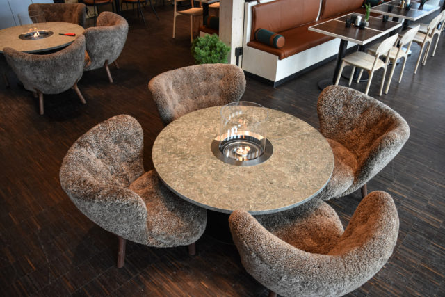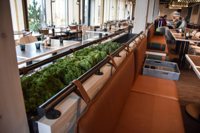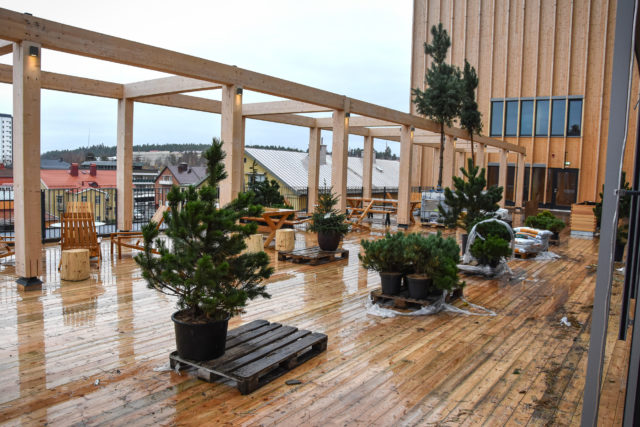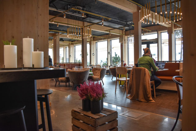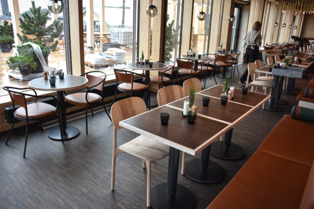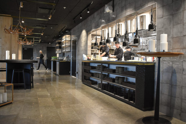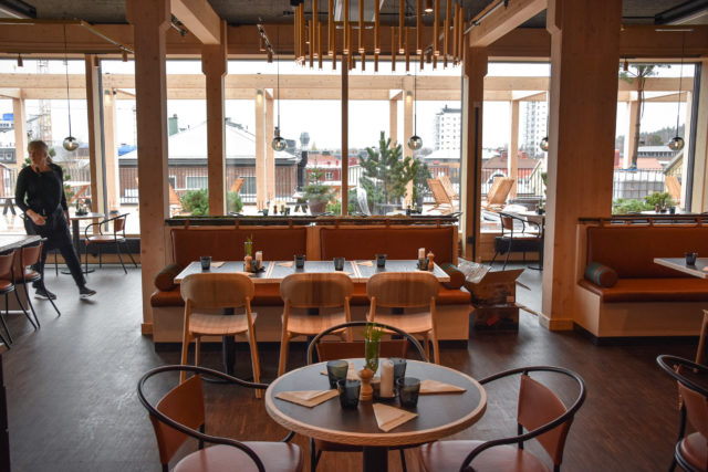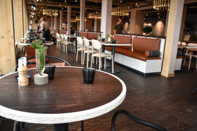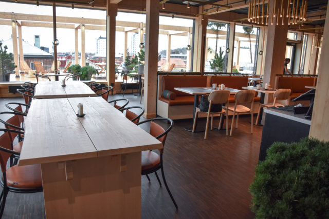 Här serveras frukost, lunch och middag. Restaurangen har 160 sittplatser, den stora terassen inte inräknad. Sabina visar och berättar att terassen även ska hållas öppen för mingel på vintern, då utrustad med värmeaggregat och plädar för trivselns skull.
