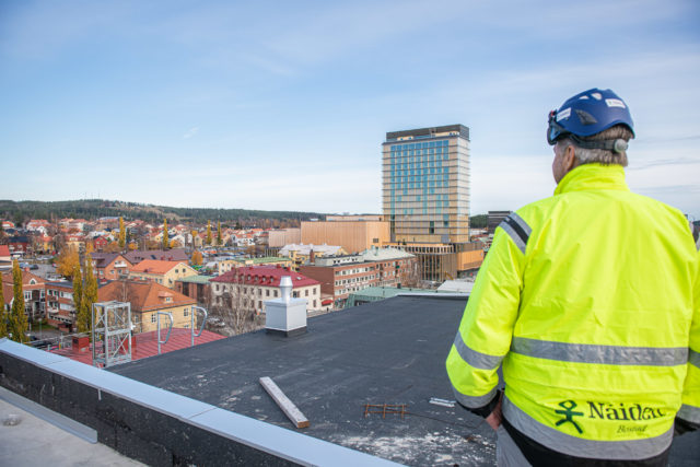 När vi druckit upp vårt kaffe bjuder Anders med mig ut på byggplatsen. Utrustade med hjälm och varselkläder kliver vi in i hissen som tar oss upp på sjunde våningen.