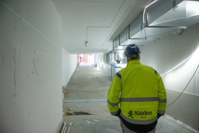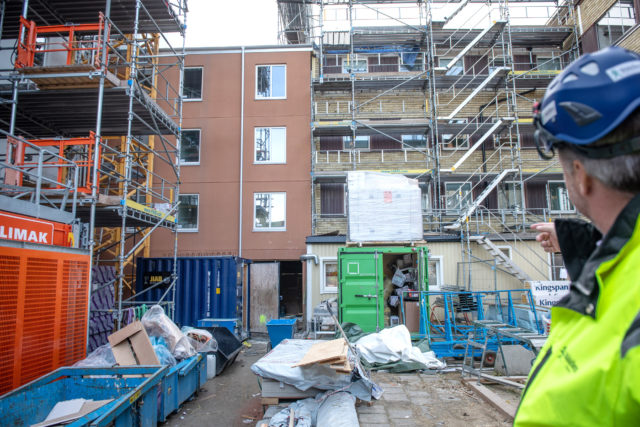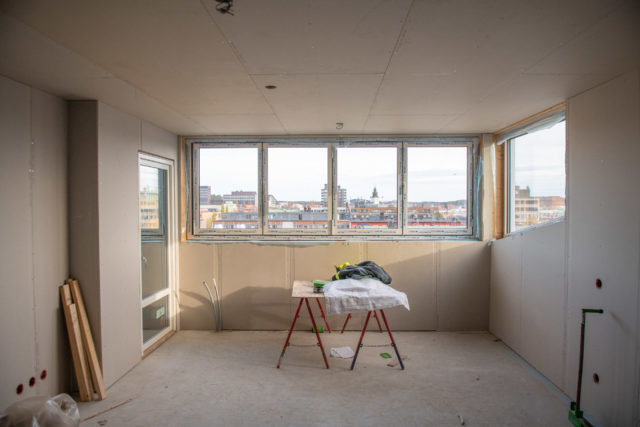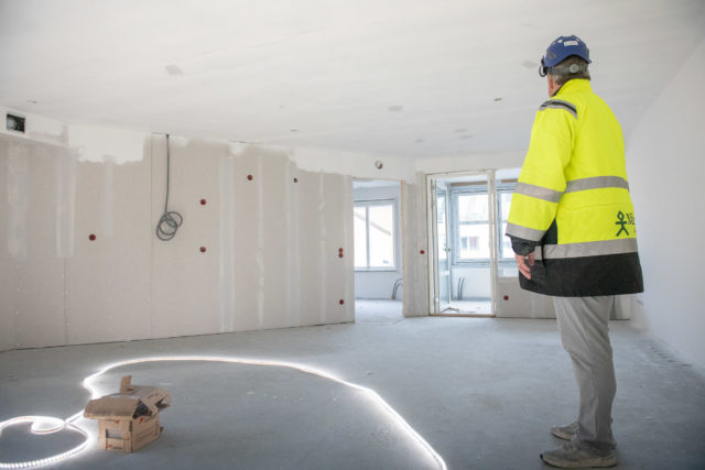 I Höderskrapan i centrum är det full aktivitet vid vårt besök. På nedersta plan har kakel och klinker satts i några badrum, och köken börjat monteras. Överlag har arbetet gått bra utan större förseningar, enligt Anders.