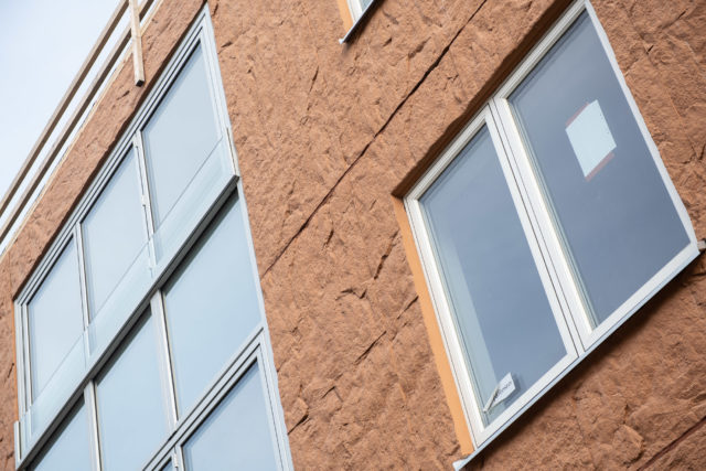 • De nedre delarna av fasaden är gjort av en typ av formgjuten sten som gnistrar i solskenet.