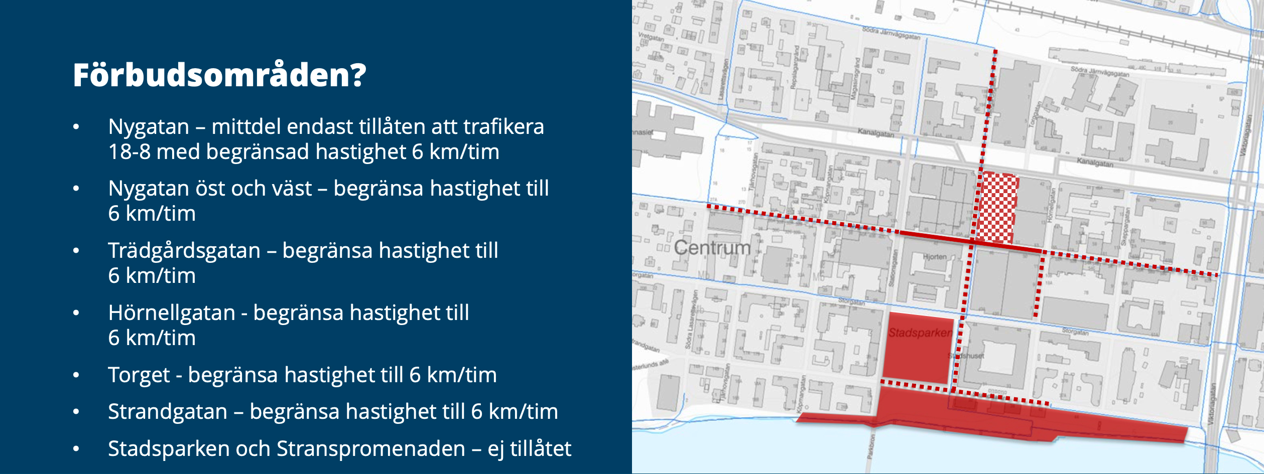 - Företaget ska låta geofenca angivna sträckor och platser så att elsparkcyklar kan köras i max 6 km/tim. Vilka sträckor som berörs tas fram av kommunen. Gångfartsområdena kan justeras i samråd med kommunen.