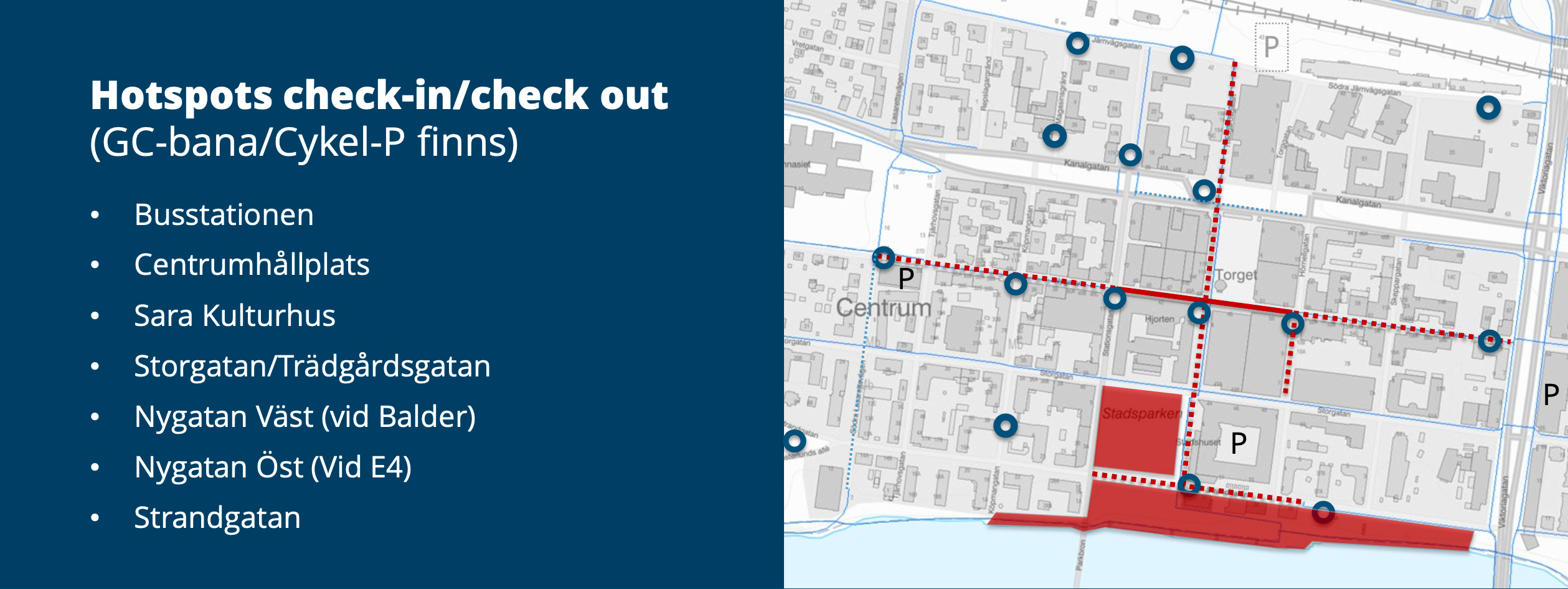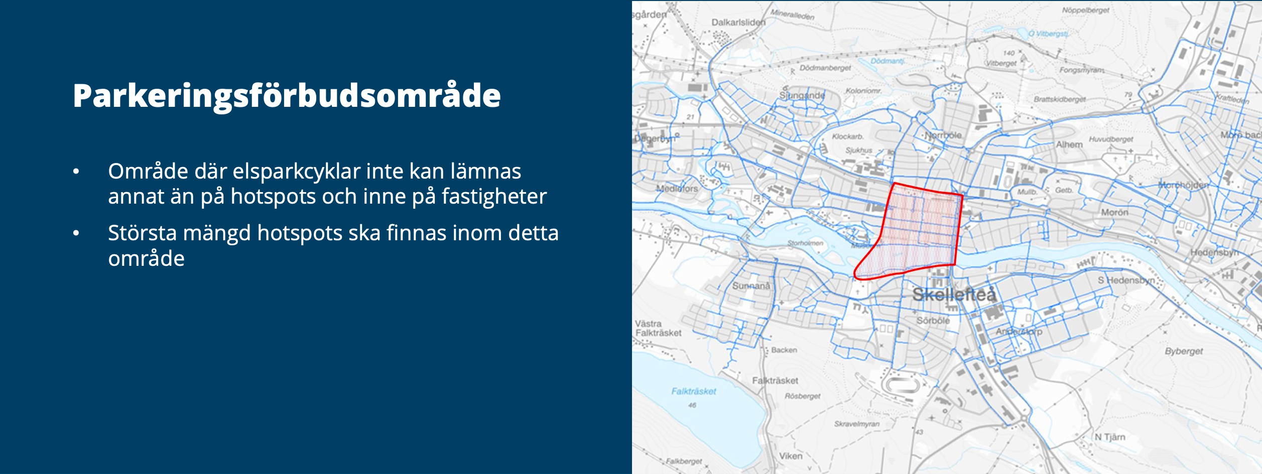 - I Skellefteå centrum ska det vara ett parkeringsförbudsområde så att elsparkcyklar kommer endast kunna återlämnas på en hotspot. Företaget ska på olika sätt uppmuntra användare att parkera sitt fordon i närmaste hotspot utanför parkeringsförbudsområdet genom till exempel information eller ekonomiska styrmedel.
