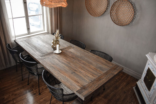 Hon visar runt i huset; förbi krukväxter, rustika trämöbler och hängande belysning. Färgerna är mer dämpade nu, mer jordnära, och känslan mer romantisk. Det tidigare blå golvet har slipats och oljats mörkt.