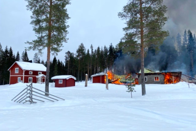 SOS larmades klockan 12.38 och räddningstjänsten ryckte ut till ladugården mellan Norrlångträsk och Fällfors. Framme på platsen möttes de av en övertänd byggnad.