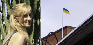 Demonstration på torget i Skellefteå mot kriget i Ukraina. Sergij Gumeniuk och Alina Levytska står i mitten.