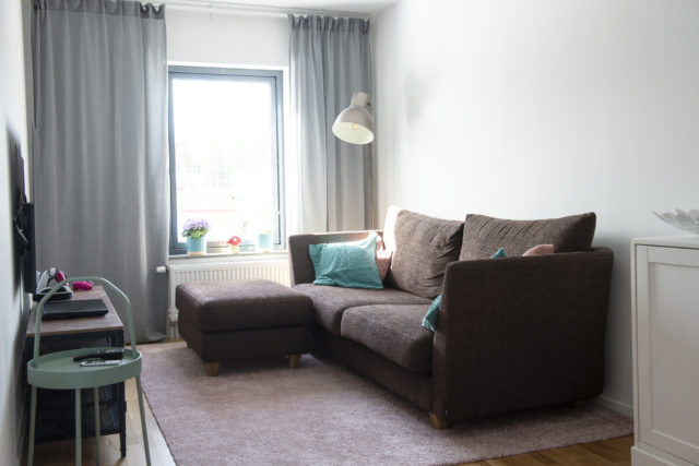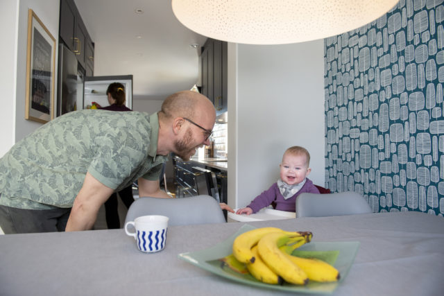 Vi slår oss ner i vardagsrummet. I skuggan på balkongen utanför fönstret ser man barnvagnen där sju månader gamla Ida sover. När blicken vandrar vidare syns landskyrkans tak sticka upp i fjärran.