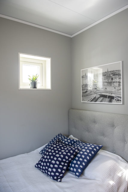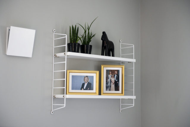 När jag kikar in i ett av gästrummen möts jag av blickarna från statsminister Magdalena Andersson och delar av kungafamiljen, som tittar ner från en Stringhylla ovanför sängen.