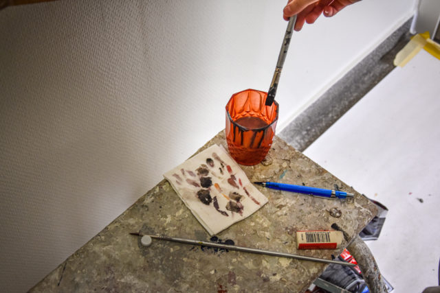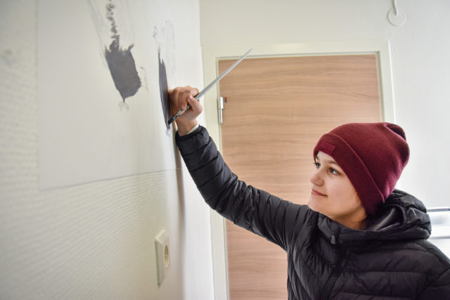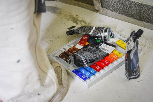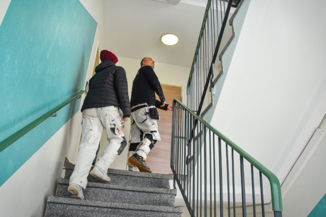 Elina har också trivts med sitt konstnärsuppdrag. Nu har hon fått jobba med akrylfärg för första gången. Det har blivit tidigare morgnar än vad Elina är van, och när solen legat på har det blivit väldigt varmt i trapphusen, men sammantaget har hon haft kul.