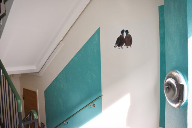 I dag pryder duvor varje våningsplan. Valet av fåglar är ingen slump, lägenhetshuset ligger i kvarteret Ringduvan och arkitekten efterfrågade just duvor: sittande på markplan, lättande på mellanplan och i flygning längst upp.