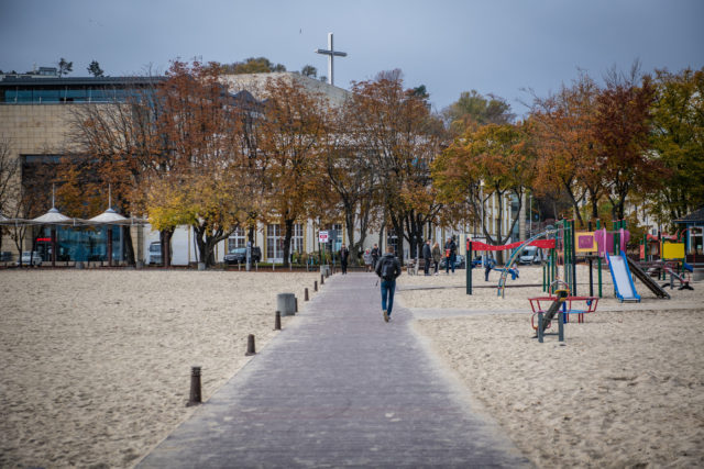 Nere vid vattnet finns en stor vacker strand. Sommartid är det fullt med badande turister, tillresta både från andra länder och från andra delar av Polen. Vår guide Grzegorz, som är uppväxt i Sopot, skulle dock själv inte bada här, säger han och pekar på fartygen som står uppradade utanför Gdańsk och Gdynias hamnar några kilometer bort.