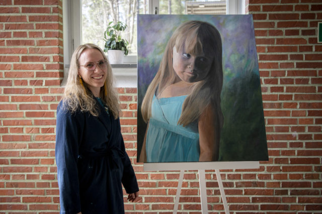 • Helena Marksén har målat ett stort porträtt i akryl av sin dotter. “Ett ansikte har så många färger. Det har varit det svåraste att få till”, säger hon.