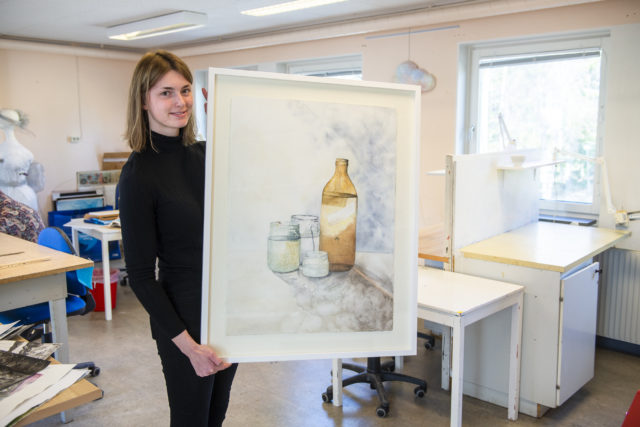 • Emelie Berg deltog i år på Liljevalchs vårsalong. Den här gången ska hon bland annat ställa ut en akvarell. “Jag målade den till en övning där vi skulle fånga hur ljuset faller genom glasburkarna”, säger hon.