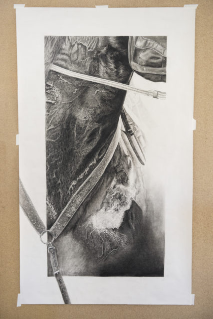 • Mycket av Emelie Bergs målning har hästmotiv. Den här blyertsteckningen är en närbild av en hästhals.