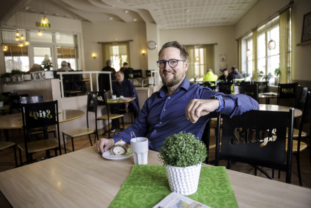 Några av cafégästerna hälsar och byter några snabba ord när de passerar bordet där ett av caféets ägare tillika Kristdemokraternas gruppledare Per Boström sitter och avnjuter sin frukostmacka med en kopp té.