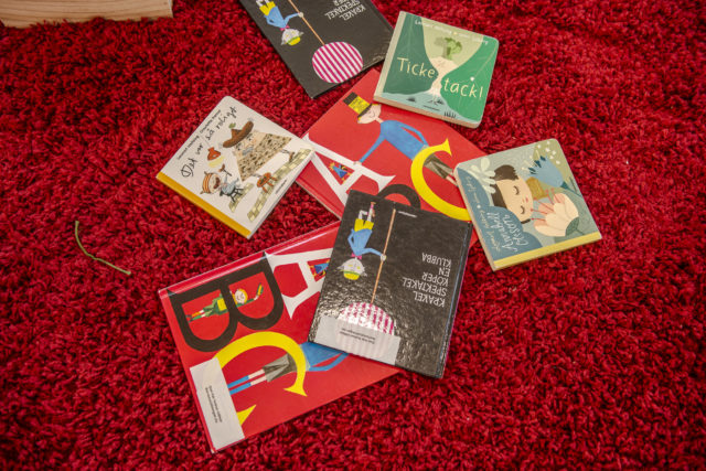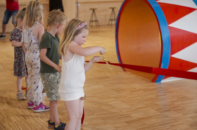 Barn från Erikslid förskola fick var sin guldsax i handen och klippte det röda bandet. Därefter utbröt stor lek när sagovärlden skulle utforskas.