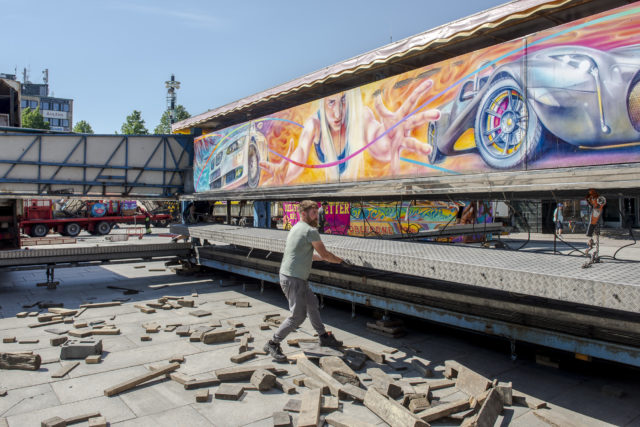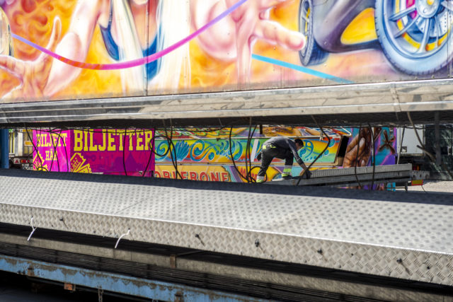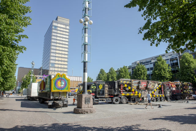 • I gassande värme monteras tivoliområdet på Guldtorget. Foto: Jonatan Stålhös