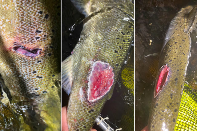 Vid Skellefteälvens kant visar Kerstin Brännström bilder av fiskar som skadats av ryckfiske. Stora köttbitar är bortslitna från kroppen där krokarna fått fäste. De öppna såren får lätt svampangrepp.